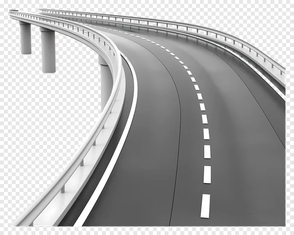 Download our high-quality, free PNG image of a sleek, modern curved highway overpass. This 3D rendered road bridge, isolated on a transparent background, features clean white guardrails, distinct lane markings, and robust supporting pillars. It's an ideal graphic for urban planning concepts, architectural visualizations, transportation designs, website layouts, presentations, or any creative project requiring a professional touch of contemporary infrastructure. Enhance your visuals with this versatile and high-resolution PNG, available for instant free download.