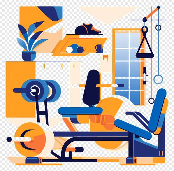 Download this eye-catching and free PNG illustration featuring a modern home gym setup, perfect for promoting health and wellness. This vibrant flat design showcases essential fitness equipment like a barbell with weights, a weight bench, a leg press machine, and a cable pulley system, all rendered in a stylish blue and orange color scheme. Ideal for fitness blogs, workout apps, gym promotions, health articles, or any project requiring a clean, professional, and energetic visual. Enhance your digital content or presentations with this high-quality, royalty-free vector art that captures the essence of an active lifestyle. Get your instant download today!