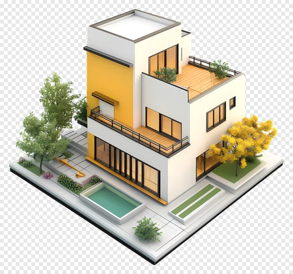 Download this stunning free PNG of a modern isometric house. This high-quality 3D render features a sleek contemporary villa with crisp white walls and a vibrant yellow accent, large windows, a flat roof deck with lush planters, and multiple balconies with railings. The property boasts a refreshing rectangular swimming pool, a beautifully landscaped garden with various trees, shrubs, and flowers, alongside a manicured lawn area, all presented on a clean white base. Perfect for architectural visualizations, real estate marketing materials, graphic design projects, presentations, or adding a touch of sophisticated realism to your next creative endeavor. Get this transparent background image instantly for free!