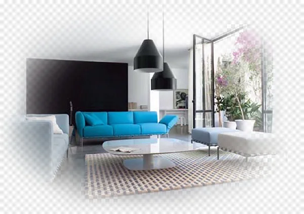 Transform your design projects with this stunning free PNG of a modern living room interior. This captivating image showcases a vibrant turquoise sofa and a lighter blue sofa, complemented by elegant black pendant lights and a chic oval coffee table. A stylish patterned area rug anchors the space, while large contemporary windows offer a beautiful view of a lush outdoor garden with blooming bougainvillea. This bright, spacious, and minimalist design exudes luxury and comfort, making it perfect for architectural visualizations, interior design mockups, presentations, or adding a touch of modern sophistication to any creative work. Download this high-resolution, transparent PNG image now and elevate your visual content with a free, premium-quality asset!