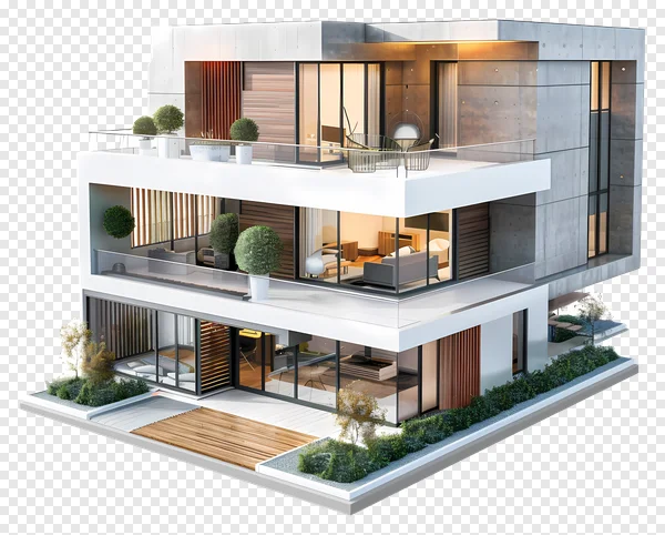 Download this exquisite modern luxury house PNG for free, featuring a stunning multi-story architectural design. This high-quality render showcases contemporary elements like sleek concrete facades, warm wooden accents, and expansive glass walls that invite natural light. Detailed balconies are adorned with elegant outdoor furniture and lush potted plants, while the ground level boasts integrated landscaping with wooden decking and green shrubs. Perfect for architectural visualizations, real estate presentations, interior design projects, or adding a touch of modern sophistication to any graphic design. Get this transparent background image instantly and elevate your creative projects with this high-end residential masterpiece.