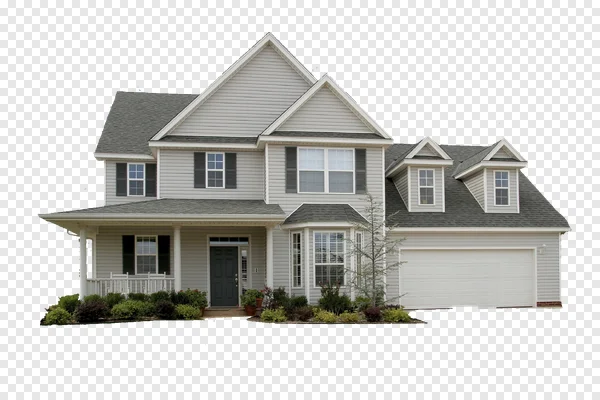 Download this stunning two-story suburban house PNG for free! This high-quality image features a modern detached home with light gray siding, a dark shingled roof, a welcoming front porch with white columns and railings, and an integrated two-car garage with a white door. Detailed elements include multiple windows, a bay window, and dormers, all complemented by lush front yard landscaping. Ideal for real estate listings, architectural visualizations, graphic design projects, or adding a realistic residential element to your digital content. Its transparent background ensures seamless integration into any creative endeavor. Get your free, high-resolution house PNG today!