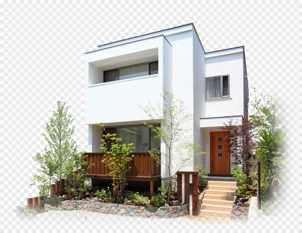 Discover this stunning modern white house PNG, perfect for your next design project. This high-quality image features a contemporary two-story residence with clean lines, a warm wooden front door, and a beautifully landscaped garden complete with a decorative stone retaining wall and a charming wooden deck. The inviting entrance includes a set of stairs leading to the door, surrounded by lush green plants and trees. The transparent background ensures seamless integration into any architectural visualization, real estate presentation, website, or graphic design. Enhance your creative works with this elegant home exterior. Download this high-resolution PNG for free and bring a touch of modern sophistication to your digital assets today!