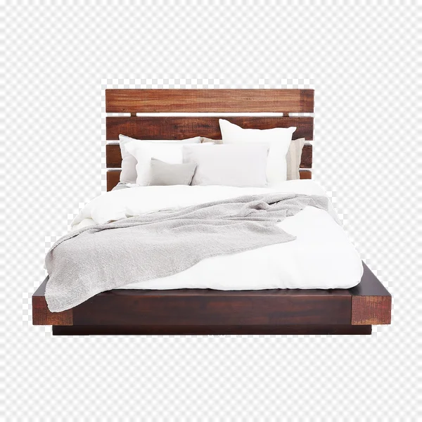 Download this high-resolution PNG image of a stylish modern bed with a rustic wooden headboard and platform base. Perfect for interior design projects, websites, brochures, or any project needing a clean, minimalist bedroom aesthetic. The image features neutral-toned bedding, enhancing its versatility. Download now and elevate your design! Free for personal and commercial use.