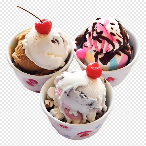 Indulge your senses with this delightful trio of ice cream sundaes, isolated on a transparent background! This high-quality PNG image features three vibrant bowls, each overflowing with scoops of creamy vanilla, rich chocolate, and colorful mixed ice creams. Generously topped with glistening red cherries, decadent chocolate syrup, sweet white drizzle, and crunchy bits, these treats are perfect for any visual project. Enhance your menus, advertisements, blog posts, or digital art with this eye-catching dessert. Download this delicious image for free and add a sweet, professional touch to your designs today! Ideal for food bloggers, graphic designers, and event planners.
