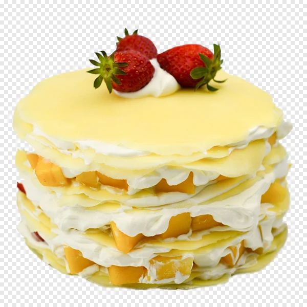 Indulge in this exquisite Mango Strawberry Mille Crêpe Cake PNG, perfect for your next project! This delicious layered dessert features delicate, thin crepes stacked with generous dollops of fluffy whipped cream and vibrant, juicy mango pieces. Crowned with fresh, ripe strawberries and extra cream, this high-quality, transparent PNG image is ideal for food bloggers, recipe websites, digital menus, graphic designers, or anyone needing a delectable visual. Download this delightful sweet treat for free and add a touch of gourmet elegance to your designs. Its bright colors and appealing texture make it an irresistible addition to any culinary theme or creative work.