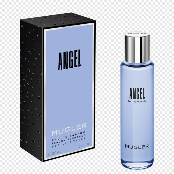 Discover and download this high-quality, free PNG image of the iconic Mugler Angel Eau de Parfum refill bottle alongside its elegant starry black packaging. This crisp, transparent background asset features the serene blue fragrance bottle with a sleek silver cap and the distinctive Angel branding. Perfect for graphic designers, beauty bloggers, e-commerce sites, or presentations looking for luxury perfume imagery. Enhance your creative projects with this premium Mugler fragrance bottle download today!