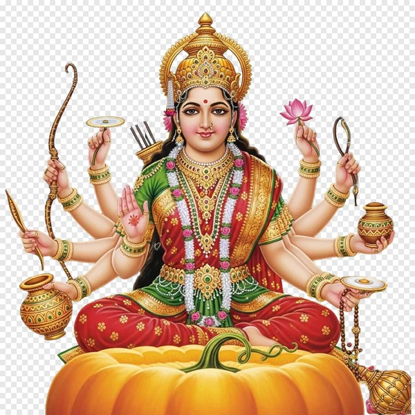 Download this captivating free PNG of a multi-armed Hindu Goddess, beautifully adorned and seated upon a vibrant pumpkin. This high-quality transparent image features the benevolent Goddess, likely Lakshmi or Durga, holding a lotus, bow, kalash, and other divine symbols, emanating prosperity and spiritual grace. Perfect for religious greetings, cultural designs, festival banners (Diwali, Navratri, harvest celebrations), educational content, or any project needing an authentic depiction of divine power and abundance. Get your free transparent PNG download today!