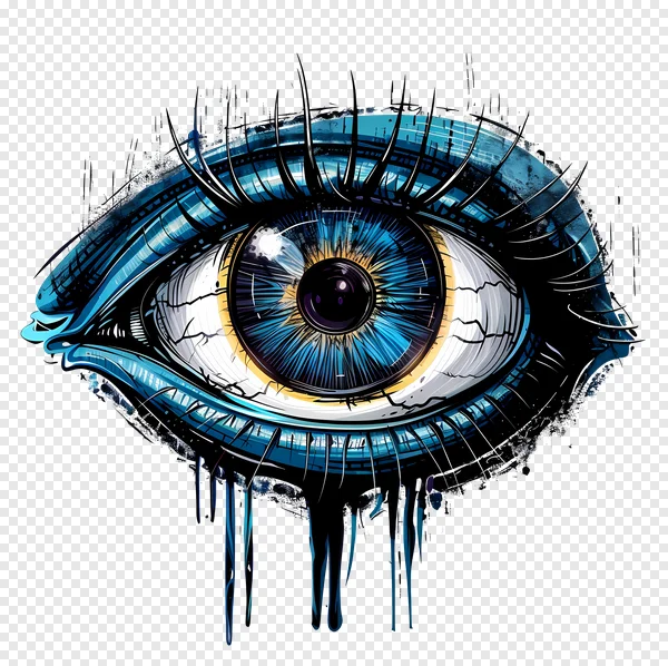 Unleash creativity with this captivating free PNG download featuring an intense, vibrant blue eye. This unique abstract illustration boasts a striking blue iris with detailed radiating lines, a distressed white sclera with subtle cracks, and stylized eyelids. Below the eye, a cool dripping paint or ink effect adds a grunge, glitch-like edge against the deep black background. Perfect for striking graphic design projects, website headers, unique social media posts, or adding an artistic touch to any digital creation. Download this high-resolution transparent image today and give your designs an unforgettable, mysterious allure.