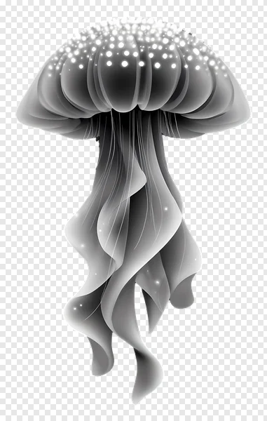 Tags: abstract bioluminescent black background deep sea digital art ethereal fantasy free png glowing glowing dots grey illustration jellyfish marine life mystical sea creature tentacles translucent transparent underwater white