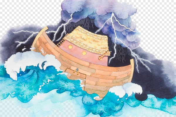 Download this captivating watercolor PNG of Noah's Ark bravely navigating a fierce storm. This vibrant illustration depicts the iconic wooden ark riding crashing waves under dark, ominous clouds with dramatic streaks of lightning and heavy rain. Perfect for educational materials, children's books, church presentations, or creative projects, this high-quality image beautifully captures the intense biblical narrative of the Great Flood. The artwork features a distinctive straw roof, portholes, and a visible giraffe, making it ideal for engaging storytelling. Get your free download now and bring this timeless tale to life in your designs!