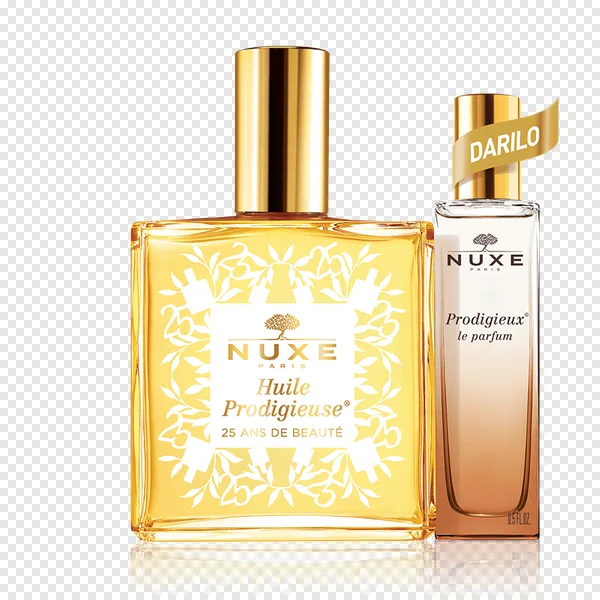 Download this exquisite, free PNG image of the iconic Nuxe Huile Prodigieuse 25 Ans de Beauté multi-purpose dry oil paired with the elegant Prodigieux Le Parfum. This high-quality, transparent background PNG is perfect for beauty blogs, e-commerce product displays, graphic design, marketing materials, or any personal project. Showcase the luxurious golden liquid of the skincare oil and the amber-toned perfume, highlighting Nuxe Paris's renowned French beauty and fragrance products. Enhance your visuals with this isolated image of premium cosmetics, ready for instant use. Get your free Nuxe beauty product image today!