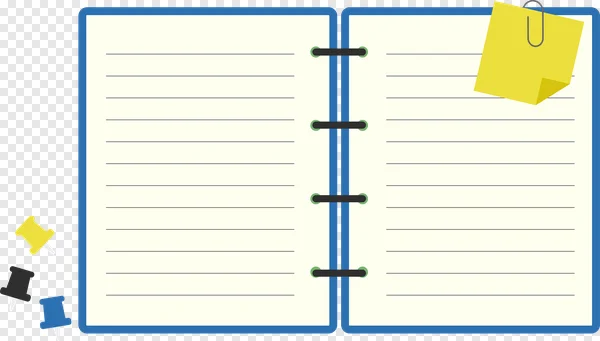Download this versatile, free transparent PNG image featuring an open notebook with a blue cover and lined pages, perfect for your digital planning needs. A bright yellow sticky note, secured with a paperclip, adds a touch of organization, while scattered yellow, black, and blue pushpins complete the office stationery theme. Ideal for presentations, educational materials, website design, or any project requiring a clean, flat illustration of planning and note-taking essentials. Enhance your designs with this high-quality, free-to-use graphic today!