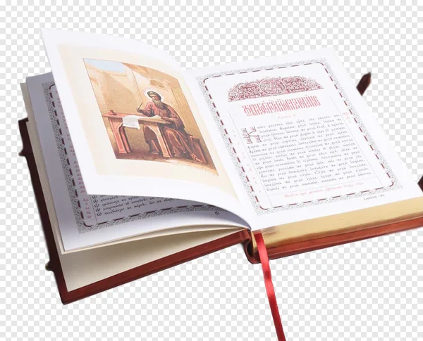 Download this exquisite free PNG of an open Orthodox holy book, featuring rich details perfect for your design projects. This vintage-style Bible or Gospel displays a beautiful illustration of a saintly evangelist writing at a desk on one page, and ornate Cyrillic scripture with decorative borders and an illuminated capital letter on the other. The deep red hardcover and red ribbon bookmark add to its classic appeal. Ideal for religious themes, historical designs, educational materials, cultural projects, or adding a touch of ancient wisdom to your creative work. Get this high-quality, transparent PNG for free today!