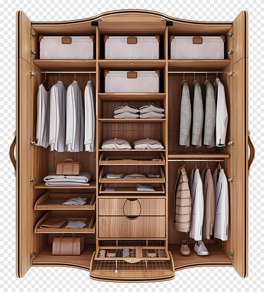 Download this high-quality open wardrobe PNG image for free! Featuring a beautifully organized wooden closet filled with neatly folded clothes, shirts, pants, and accessories. Perfect for interior design projects, presentations, website graphics, or adding a realistic touch to your digital artwork. Enhance your visuals with this detailed and versatile closet image – download now and use it freely!