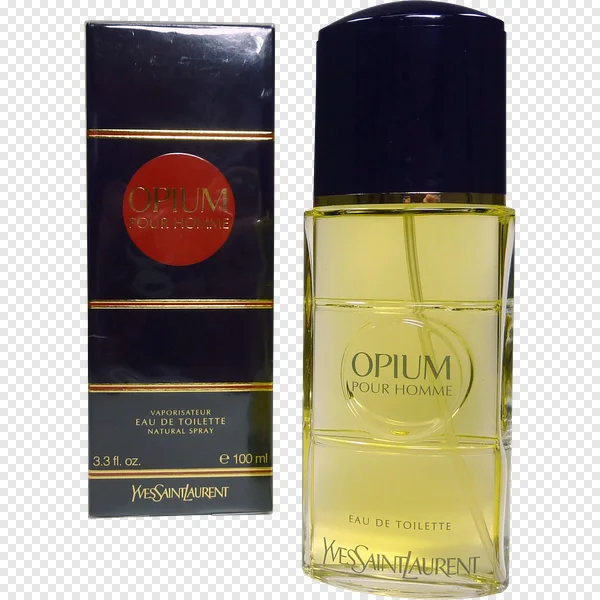 Download this high-quality PNG image featuring the iconic Opium Pour Homme Eau de Toilette by Yves Saint Laurent. This free transparent background image displays both the elegant men's fragrance bottle with its signature black cap and the sophisticated dark blue and gold packaging box, showcasing the classic YSL branding and '3.3 fl. oz.' (100ml) volume. Perfect for e-commerce, graphic design projects, beauty blogs, marketing materials, or any visual content needing a premium men's cologne asset. Get this luxurious fragrance PNG for free today!