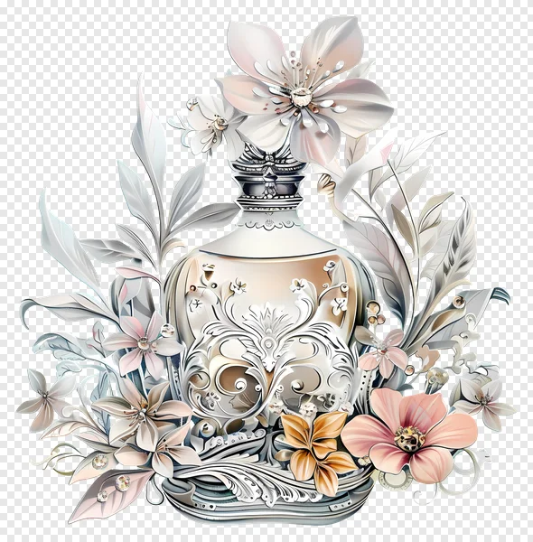 Delight in this exquisite free PNG featuring a luxurious, ornate perfume bottle set amidst a vibrant arrangement of pastel flowers and elegant foliage. The vintage-inspired design showcases intricate filigree and delicate scrollwork in shades of white, cream, pink, and hints of gold, all beautifully contrasted against a deep black background. Perfect for enhancing graphic design projects, invitations, websites, or digital art. Download this high-quality, transparent floral fragrance bottle PNG for free and add a touch of timeless elegance and sophisticated beauty to your creations. Ideal for branding, fashion, beauty, and decorative themes.