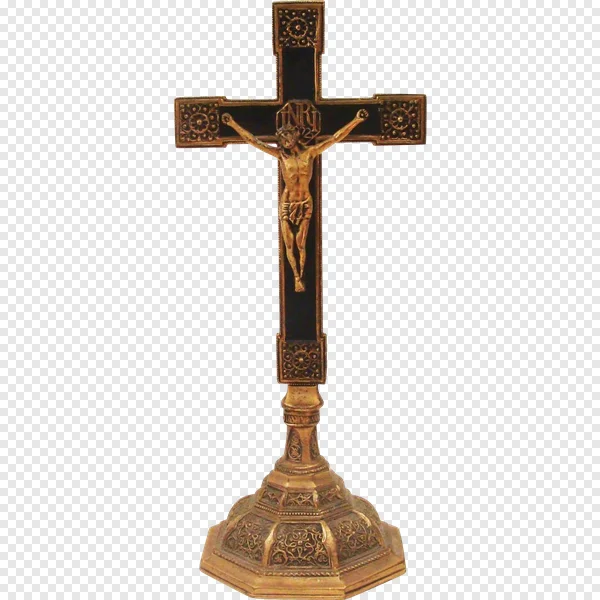 Download this exquisite PNG of an ornate gold and black standing crucifix for free. This vintage-style altar cross features a detailed golden figure of Jesus Christ, complete with the 'INRI' inscription, and rests on a beautifully patterned hexagonal base. Perfect for religious projects, sermon illustrations, educational materials, or personal spiritual use. Get your high-quality, transparent background image today to enhance your designs with a powerful symbol of faith and devotion. Ideal for church bulletins, worship slides, or website graphics.
