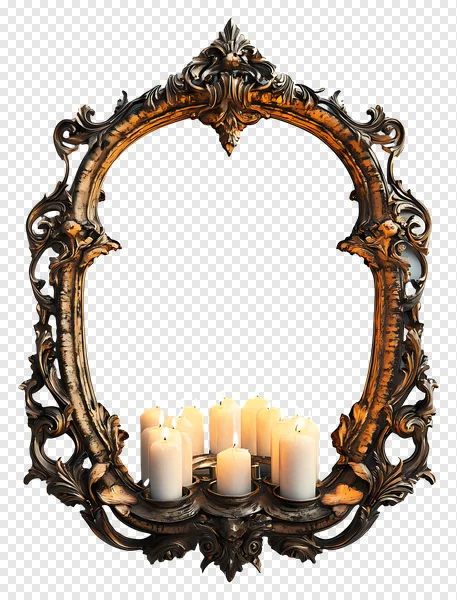 Download this stunning, high-resolution PNG image of an ornate gold frame adorned with lit candles. Perfect for adding a touch of elegance, vintage charm, or a spooky ambiance to your designs. Use it for invitations, graphics, website backgrounds, or any project needing a luxurious and atmospheric element. Free for personal and commercial use! Enhance your creative projects with this beautiful, transparent background image.