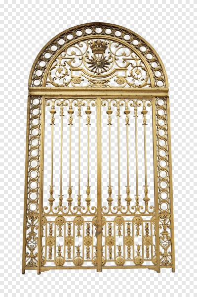 Download this stunning high-resolution PNG image of an ornate gold gate. Perfect for design projects needing a touch of elegance and grandeur. The intricate details, including the arched top, sunburst motif, and floral accents, make it ideal for backgrounds, textures, or design elements in architectural visualizations, invitations, and more. This meticulously crafted gate image is ready to elevate your creative work. Download now!