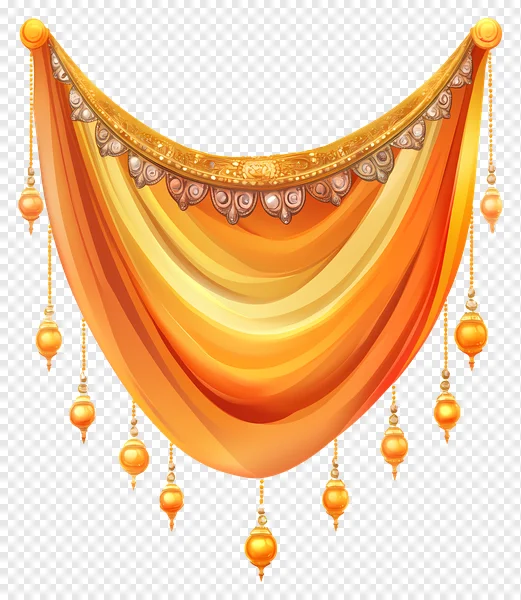 Instantly elevate your creative projects with this exquisite free PNG of an ornate golden orange festive swag. This transparent digital asset showcases beautifully draped fabric in rich, warm hues, adorned with a highly detailed golden border featuring intricate patterns. Delicate, lantern-style pendants hang gracefully, adding a touch of traditional elegance. Perfect for designing wedding invitations, festive greeting cards, cultural event banners, or luxurious digital backgrounds. Download this high-quality, Indian-inspired decorative element for free and infuse your designs with celebratory charm.