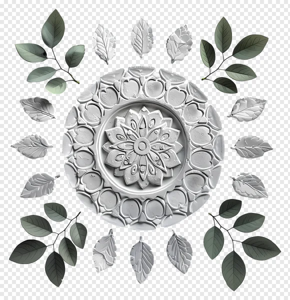 Elevate your creative projects with this stunning free PNG featuring a sophisticated composition of an ornate white floral bas-relief and botanical leaves. The central circular element showcases intricate mandala-like patterns, beautifully framed by individual 3D-rendered white sculpted leaves and elegant green illustrated foliage branches. Set against a transparent background, this versatile decorative element is perfect for adding a touch of classical elegance, natural charm, or artistic flair to web designs, print materials, digital art, invitations, or scrapbooking. Download this unique, high-quality design resource for free and infuse your work with detailed botanical artistry and sculptural beauty.