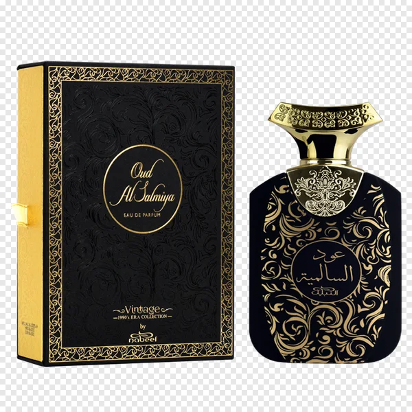 Download a high-quality, transparent PNG image of the luxurious Oud Al Salmiya perfume bottle by Nabeel. Perfect for graphic design, product mockups, website visuals, and more! This free PNG features the elegant black and gold packaging and intricate bottle design. Enhance your projects with this stunning, royalty-free image. Get your free download now!