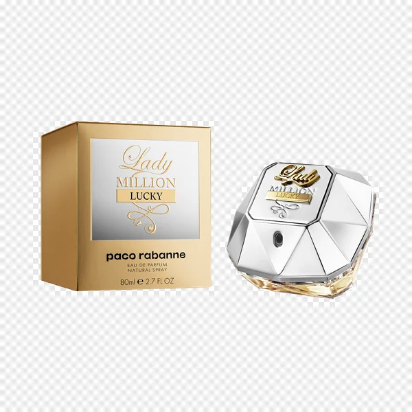Download the exquisite Paco Rabanne Lady Million Lucky perfume PNG for free. This high-resolution image features the iconic diamond-shaped silver and gold bottle alongside its elegant golden packaging box, showcasing the 'Lucky' edition in stunning detail. Perfect for beauty bloggers, e-commerce stores, graphic designers, or anyone needing a luxurious fragrance visual for their projects. With a transparent background, it's ideal for adding a touch of glamour and sophistication to your fashion, cosmetic, or lifestyle content. Get your premium Lady Million Lucky Eau de Parfum asset today and elevate your designs!