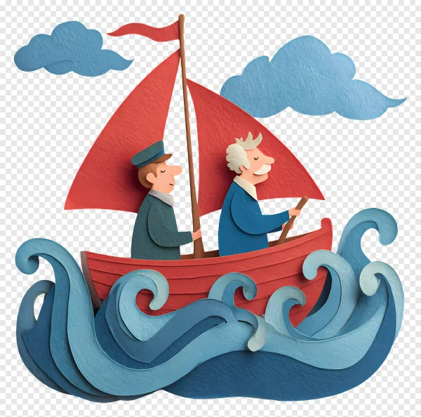 Embark on a charming digital journey with this free, high-quality PNG featuring a beautiful paper cut illustration. Two distinct men, an older captain with a mustache steering a red sailboat and a younger companion, bravely navigate choppy blue waves under a cloudy sky. The unique layered texture and whimsical style of this paper craft art add depth and character to the nautical scene. Perfect for children's books, educational materials, maritime-themed designs, creative presentations, or any project needing a touch of adventure. Download this transparent background PNG today and set sail with your designs!