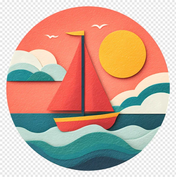 Download this stunning, high-quality free PNG of a vibrant paper cut style sailboat gracefully navigating the ocean waves. This charming summer illustration features a red and yellow sailboat under a coral sky with a bright orange sun, peaceful white clouds, and soaring birds, all rendered in a unique layered, textured design. Perfect for your graphic design projects, presentations, website banners, social media posts, or printable crafts. Get this beautiful, minimalist nautical artwork instantly for your creative needs!