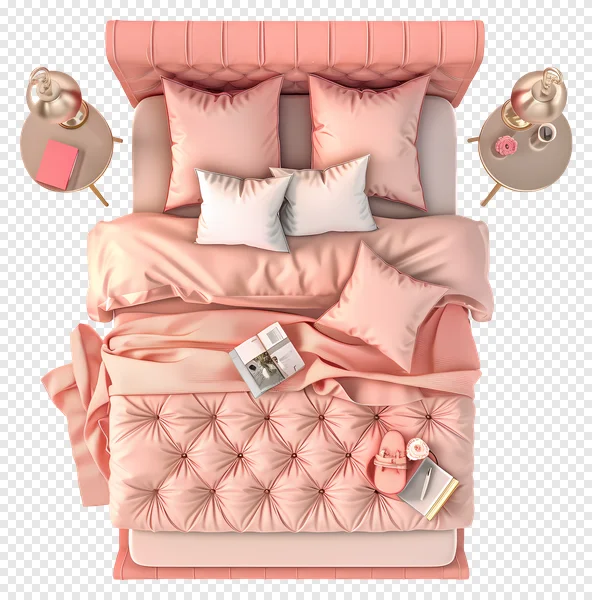 Download this stunning high-resolution PNG image of a luxurious blush pink bedroom. Perfect for interior design blogs, websites, presentations, or social media posts. The top-down view showcases a tufted headboard, plush bedding, and stylish bedside tables. Enhance your projects with this elegant and versatile image, free for download! The image features soft pink hues, luxurious textures, and tasteful details, providing a high-quality visual for your design projects. Download now and add a touch of sophistication to your work!