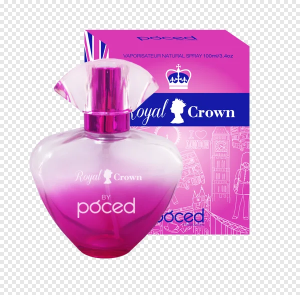 Download this exquisite Poced Royal Crown Perfume PNG for free! This high-quality image features a stunning pink ombre heart-shaped fragrance bottle with a clear, faceted cap. The packaging showcases a regal crown, queen silhouette, and charming London landmarks like Big Ben, a double-decker bus, and a guard, all set against a vibrant magenta backdrop with a subtle Union Jack. Perfect for beauty blogs, e-commerce, graphic design, or any project needing an elegant and royal-themed perfume visual. Get your transparent background PNG today and add a touch of British luxury to your designs!