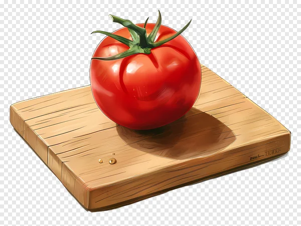 Download this high-quality, realistic tomato PNG image for free! Perfect for food blogs, recipe websites, graphic design projects, or any creative endeavor. This vibrant illustration features a ripe, red tomato with a detailed green stem, resting on a wooden cutting board. Transparent background for easy integration into your designs. Enhance your visuals with this fresh and appealing produce graphic – download now!