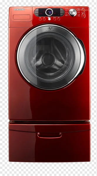 Download this high-resolution PNG image of a sleek, red Samsung washing machine. Perfect for appliance websites, brochures, or design projects needing a modern, stylish appliance image. The image features a detailed view of the control panel, showcasing features like Silver Nano Technology and various wash cycles. Download now for free and enhance your visuals!