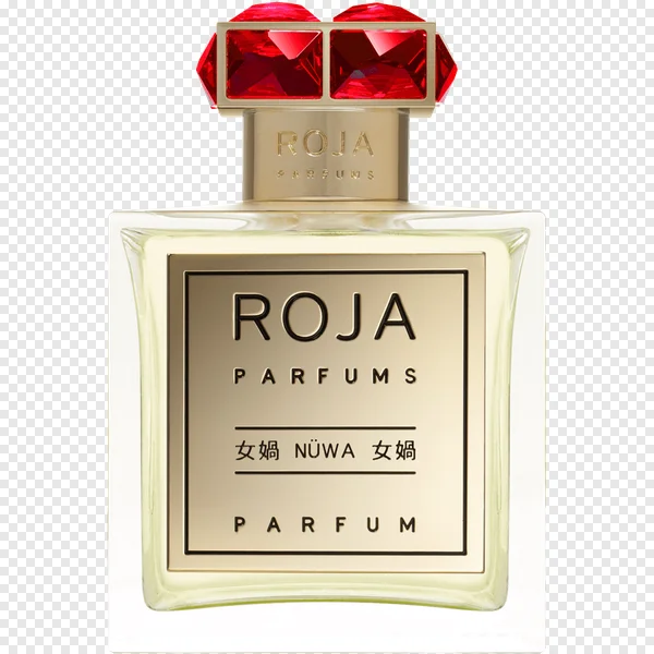 Download a high-quality, transparent PNG image of the luxurious Roja Parfums Nuwa perfume bottle. Perfect for graphic design projects, website visuals, social media content, or presentations. This stunning image showcases the bottle's unique design with its red gem-like cap and elegant gold accents. Get this free PNG now and add a touch of sophistication to your work! No attribution required.