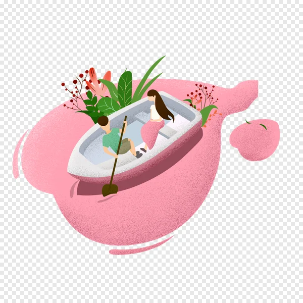 Embark on a visual journey with this charming free PNG illustration featuring a romantic couple gently paddling a boat on serene pink water. The flat design style, accented with subtle texture, beautifully depicts a man and woman surrounded by lush green foliage and vibrant red berries. Perfect for adding a touch of romance, nature, or adventure to your personal projects, websites, blogs, or digital designs. This high-quality, transparent background PNG is ideal for themes related to relationships, travel, peaceful moments, or spring/summer vibes. Download this delightful image for free and let its enchanting simplicity elevate your creative work.