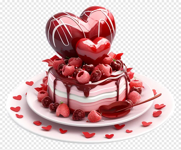 Celebrate love with this stunning free PNG image of a Romantic Valentine's Day Heart Cake! This delectable dessert features a beautifully layered pink and white cake, generously topped with a rich chocolate drizzle and an assortment of fresh red berries including strawberries, raspberries, and cherries. Two glossy red heart decorations majestically crown the cake, while smaller scattered hearts and a charming heart-shaped spoon complete the festive presentation. Perfect for Valentine's cards, romantic promotions, digital artwork, or any project needing a touch of sweet affection. Download this high-quality transparent PNG for your creative needs and add a delightful, loving touch to your designs!