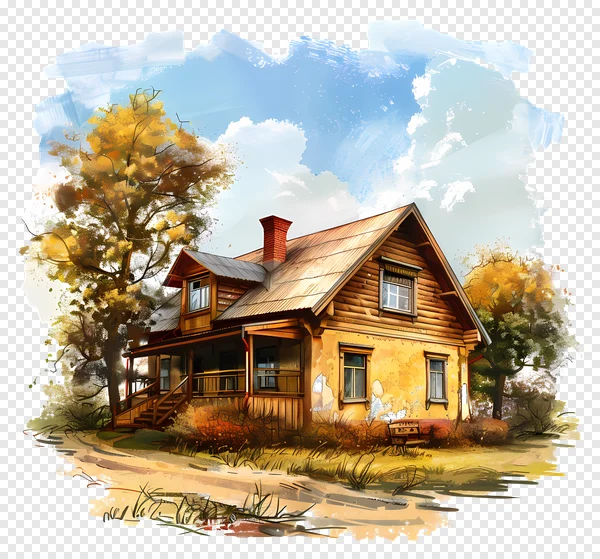 Tags: architecture autumn leaves blue sky charming house chimney country home cozy digital art fall season fall trees free PNG hand-painted old house picturesque rural landscape rustic house transparent background village house watercolor painting wooden porch