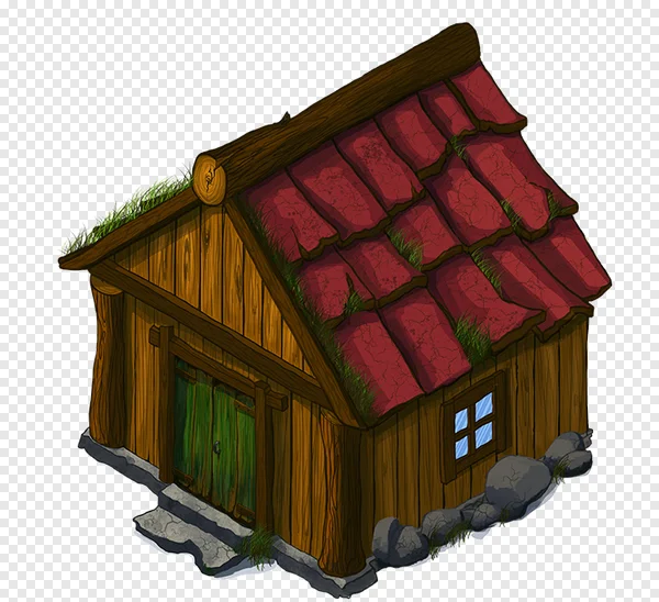 Download this captivating free PNG of a rustic wooden cabin, perfect for your next creative project! This high-quality isometric illustration features a charming house with weathered wooden walls, a distinctive red tiled roof adorned with green moss, sturdy green double doors, and a cozy small window. The transparent background ensures seamless integration into game development, fantasy illustrations, village scenes, web design, or any graphic design venture. Ideal for adding a touch of medieval or cozy charm to your digital assets. Get your transparent background house graphic today!
