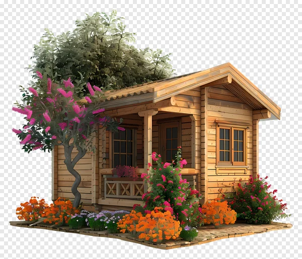 Discover this charming rustic wooden log cabin PNG, meticulously designed with a cozy porch, quaint windows, and a classic timber aesthetic. It's surrounded by a vibrant, lush garden featuring an array of colorful blooming flowers in pink, orange, and purple hues, plus a majestic tree with delicate pink blossoms. This high-quality, transparent background PNG is perfect for adding a touch of nature and warmth to your architectural visualizations, scrapbooking projects, digital art, or any design needing an idyllic countryside touch. Download this beautiful garden cabin image for free and elevate your creative work today!