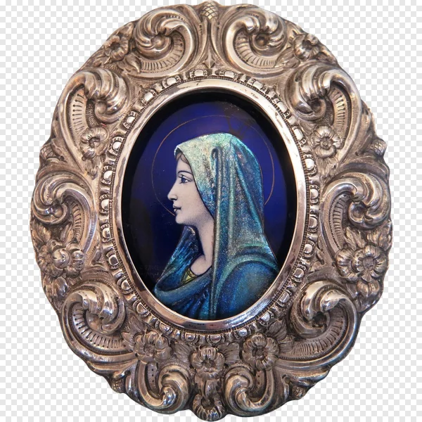 Discover this exquisite free PNG featuring a stunning antique enamel portrait of the Virgin Mary, framed within a richly ornate silver-colored oval frame. The sacred depiction shows the Madonna in profile, adorned with a shimmering blue-green veil against a deep blue background, highlighted by a subtle halo. The frame itself is a masterpiece of craftsmanship, boasting intricate floral and rococo-style scrollwork designs. Perfect for religious projects, vintage-themed designs, prayer cards, scrapbooking, or adding a touch of classic devotion to any digital or print media. Download this high-quality transparent PNG for your creative endeavors today!