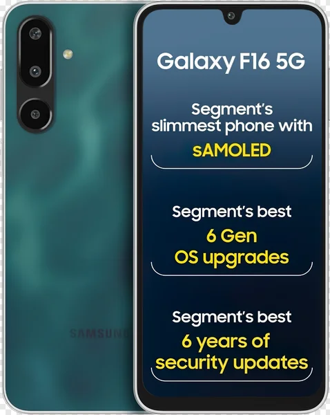 Samsung Galaxy F16 5G PNG Download: High-Quality Transparent Images Free for Glam Green, Bling Black & Vibing Blue