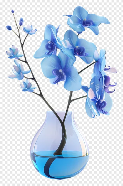Download this captivating transparent PNG of vibrant blue orchids beautifully arranged in a sleek, modern glass vase filled with blue water, set against a striking black background. This high-quality free image is perfect for adding a touch of elegance and serenity to your digital projects, website banners, presentations, social media graphics, or print designs. The clear cut-out ensures easy integration into any layout. Get your free, stunning floral PNG today and elevate your creative work!