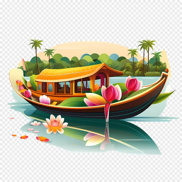 Discover a stunning, free PNG illustration featuring a serene houseboat adorned with vibrant lotus flowers navigating tranquil tropical backwaters. This high-quality graphic showcases lush palm trees and distant hills under a soft sky, perfect for travel blogs, presentations, nature-themed projects, or digital art. Download this transparent background image for personal and commercial use to add an exotic, peaceful touch to your designs. Ideal for conveying relaxation, vacation, and natural beauty. Get your transparent Kerala-style houseboat vector PNG today for a touch of picturesque charm!