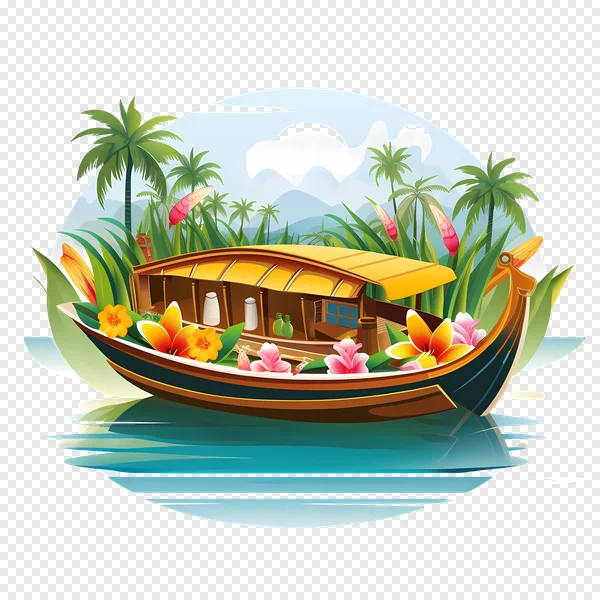 Immerse yourself in the tranquility of this stunning tropical houseboat illustration. Featuring a traditional Kerala Kettuvallam gliding through serene backwaters, surrounded by lush palm trees, vibrant exotic flowers, and distant mountains under a blue sky. This beautiful vector art captures the essence of a peaceful nature retreat, perfect for travel blogs, presentations, website design, or educational materials. Download this high-quality, transparent PNG for free and add a touch of exotic charm to your next project! Ideal for designs related to Indian tourism, serene landscapes, or tropical vacations.