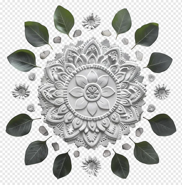Tags: botanical decorative PNG elegant floral carving free download green leaves gypsum carving meditation nature elements ornamental peaceful round design serene spiritual design symmetrical art tranquil transparent background white flower white mandala zen stones