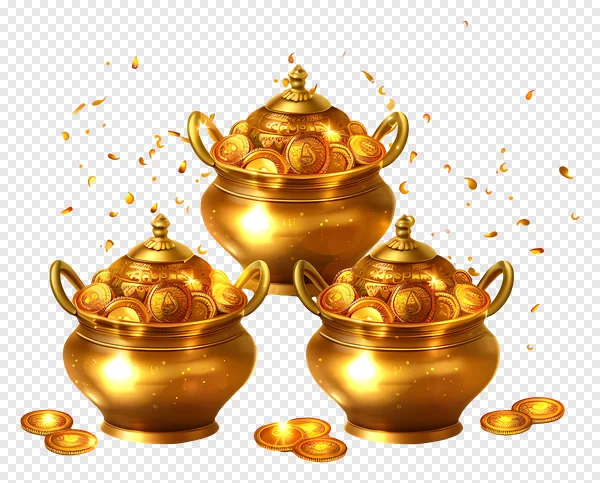 Discover this exquisite free PNG image featuring three shimmering golden pots, brimming with ancient gold coins. Scattered coins and glowing golden particles add to the magical aura, symbolizing wealth, prosperity, and abundance. Perfect for designs related to finance, festivals like Diwali or Dhanteras, good luck charms, or any project needing a touch of rich, golden splendor. Download this high-quality, transparent background graphic to enhance your websites, marketing materials, or celebratory visuals. A vibrant representation of fortune and success awaits your creative use!