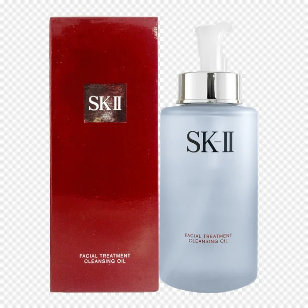 Download this high-quality PNG image of SK-II Facial Treatment Cleansing Oil for free. This compelling visual showcases the elegant frosted blue-grey bottle with its signature silver pump dispenser, positioned next to its vibrant red retail packaging. Perfect for beauty blogs, e-commerce stores, product reviews, marketing campaigns, or graphic design projects needing a premium skincare asset. The transparent background ensures seamless integration into any design. Get your SK-II Cleansing Oil PNG now and elevate your content!