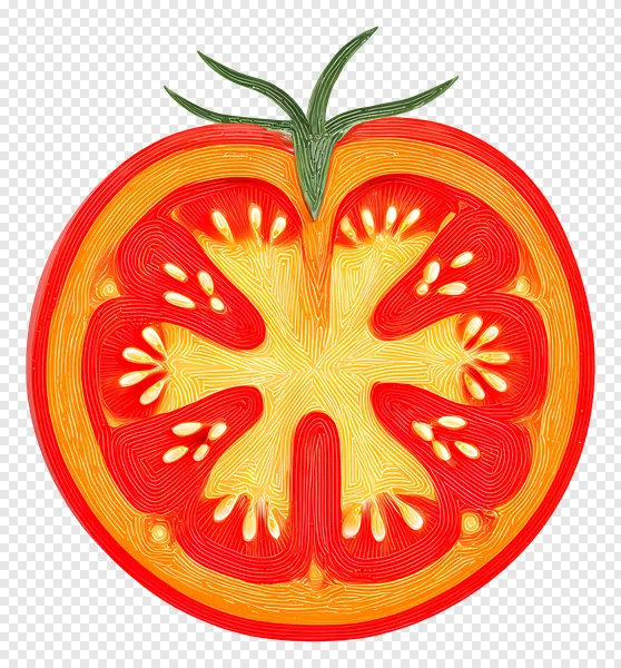 Download this vibrant, high-quality sliced tomato PNG image for free! Perfect for food blogs, recipe websites, health & nutrition projects, or any design needing a fresh, natural element. This detailed illustration showcases the inside of a tomato with seeds and a green stem, isolated on a black background. Use it to enhance your visuals and add a touch of organic beauty. Free for personal and commercial use!
