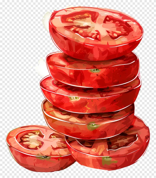 Download this high-quality, free PNG image of a vibrant stack of sliced tomatoes! Perfect for food blogs, recipe websites, health & nutrition content, or any project needing a fresh, organic element. This detailed illustration features realistic tomato slices with visible seeds and stems, isolated on a black background. Enhance your designs with this versatile and visually appealing tomato graphic – download now and use it freely!